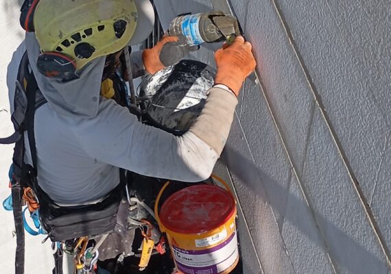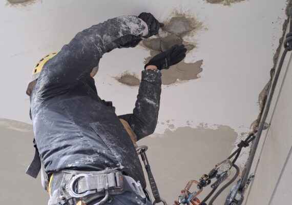 Мы очищаем повреждённые зоны, обрабатываем арматуру, восстанавливаем бетон ремонтными составами и наносим гидроизоляцию. Работы выполняются с верёвочного доступа, без лесов и лишнего вмешательства.